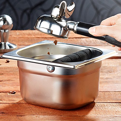 Unentbehrlich für jeden Barista: Im schlichten Abschlagbehälter aus robustem Edelstahl ist Ihr Trester nach dem Brühvorgang bestens aufgehoben. Einfach Siebträger aus der Maschine drehen und an der Abklopfstange ausklopfen.
