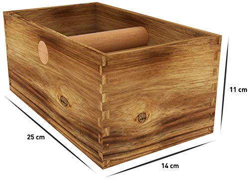 Schlichtes Design. Robuste Materialien. Einfache Handhabung. Perfekte Größe. All das zeichnet unseren aus hochwertigem Akazienholz gefertigten Abklopfbehälter aus. Um eine beständige Oberfläche zur Reinigung zu erhalten wurde diese mit einer farblosen Beschichtung behandelt und gewährt somit maximale Haltbarkeit.