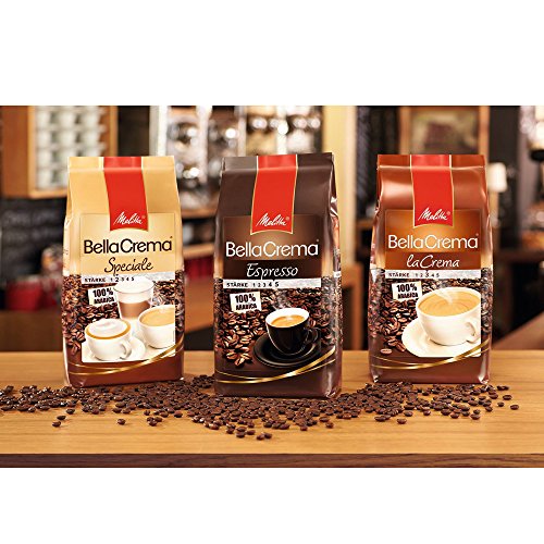 100 % Arabica, reiches Aroma, intensiv-würziger Geschmack, kräftiger Röstgrad, Stärke 4 bis 5, BellaCrema Espresso,