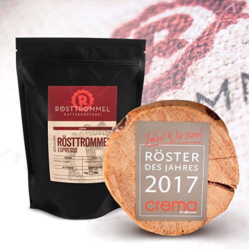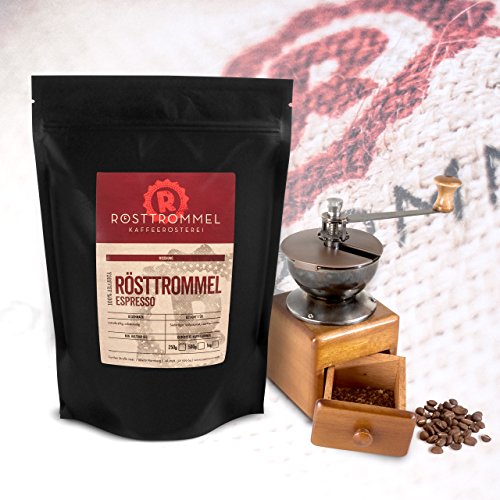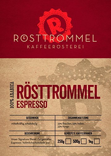 Der Rösttrommel Espresso ist eine reine Arabica-Mischung und daher milder wie die Mischungen Mondiale und Kaiserburg. Er ist außerdem komplexer und hat ein dezente, angenehme Spritzigkeit.