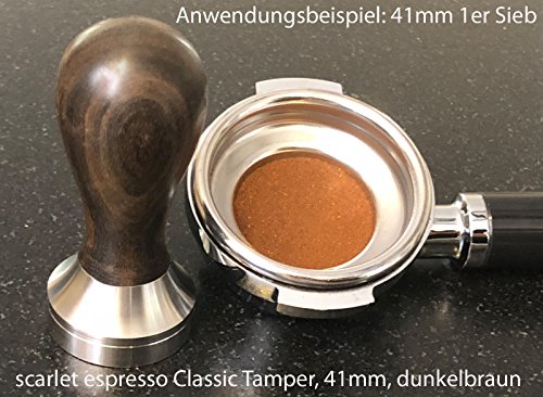 Der ergonomisch geformte Edelholzgriff schließt perfekt an die präzisionsgefertigte Tamperbase aus rostfreiem Edelstahl an und unterstützt das sehr gute Handling.