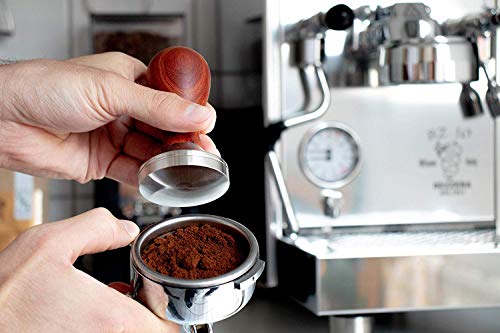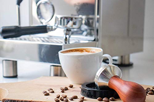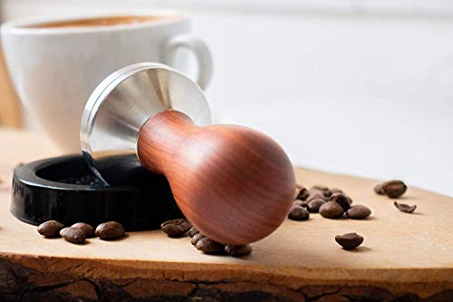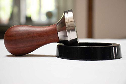 Tamper (51mm Durchmesser) mit ergonomischem Holzgriff und Edelstahlboden sowie dazugehöriger Tamperstation für Espresso / Siebträger Maschinen.