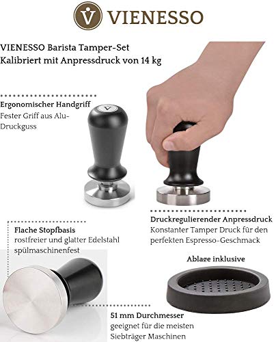 VIENESSO steht für Qualität und höchsten Kaffeegenuss. Unser druckregulierender Espresso-Stampfer zeichnet sich durch einen robusten und flachen Edelstahlfuß aus. Durch die integrierte Feder kann der perfekte Anpressdruck von 14 kg für das Kaffeepulver problemlos in den Siebträger gepresst werden – ideal um den perfekten Espresso zu kreieren.